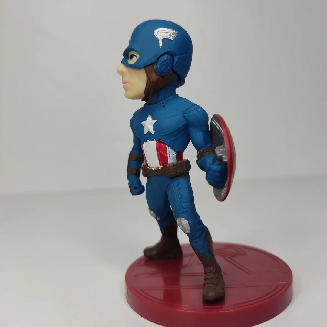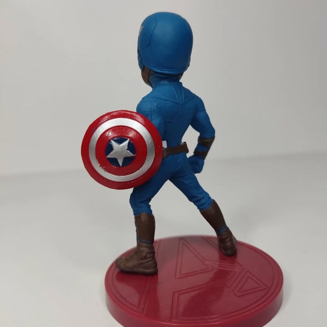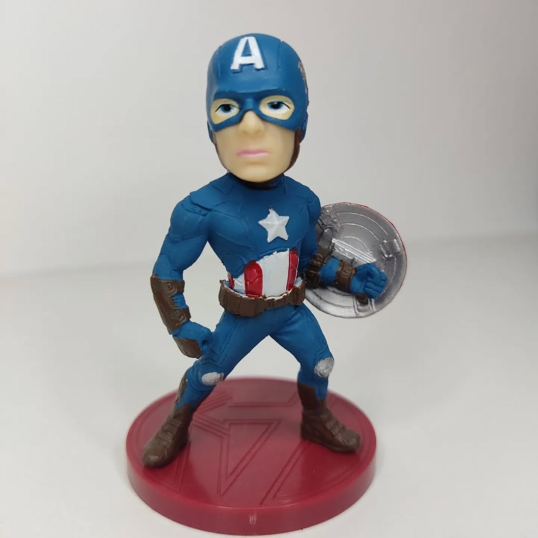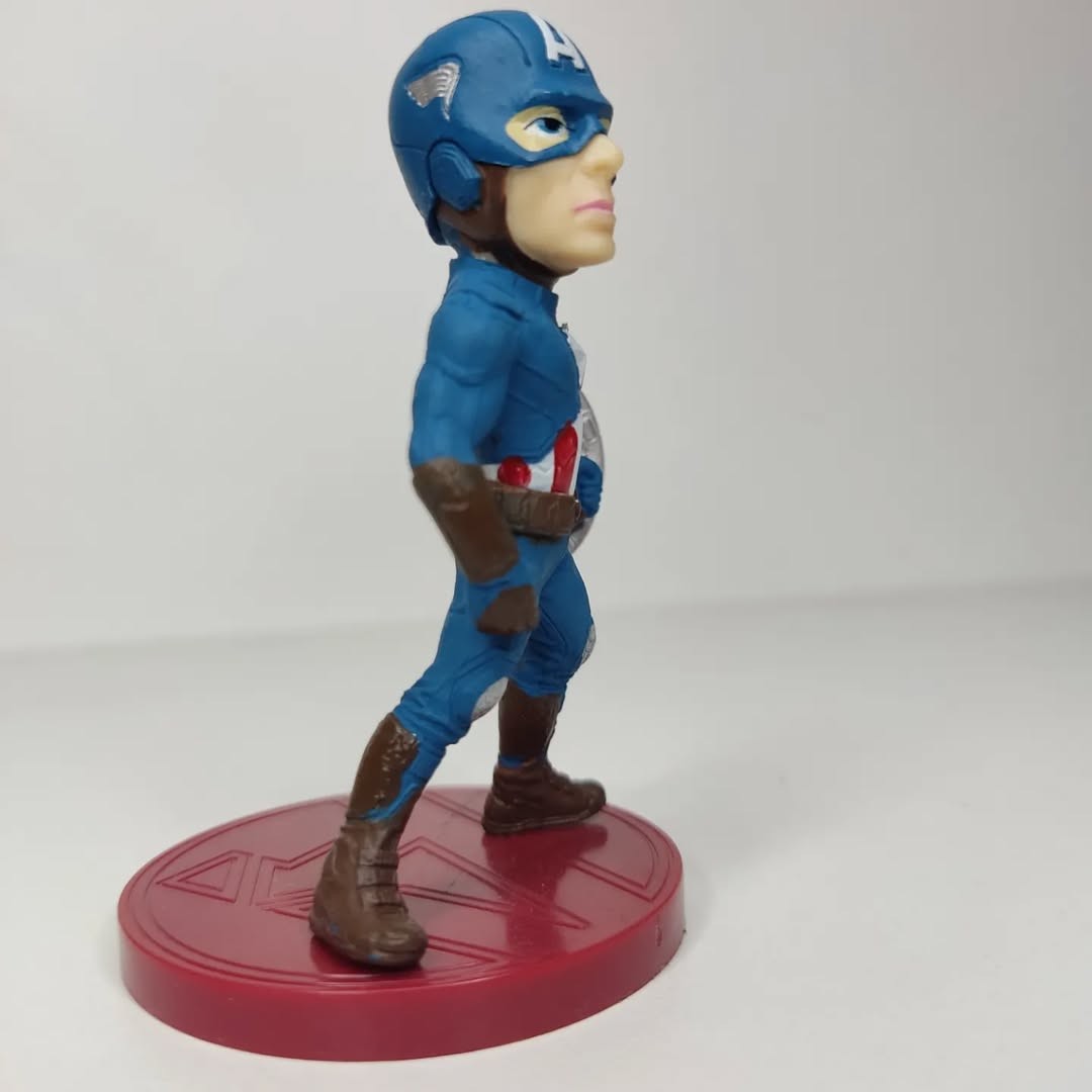 Capitán América De Avengers es una figura no articulada. Con base y soporte. Material de PVC. Figurita de 8Cm de alto. Viene sin caja.