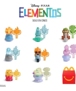 La colección completa de Elementos en McDonald’s, lanzada en junio de 2023, incluye a Ember en su Scooter, Wade en el Water Car, Bernie en el Tanker Truck y a Clod en el Log Trike.